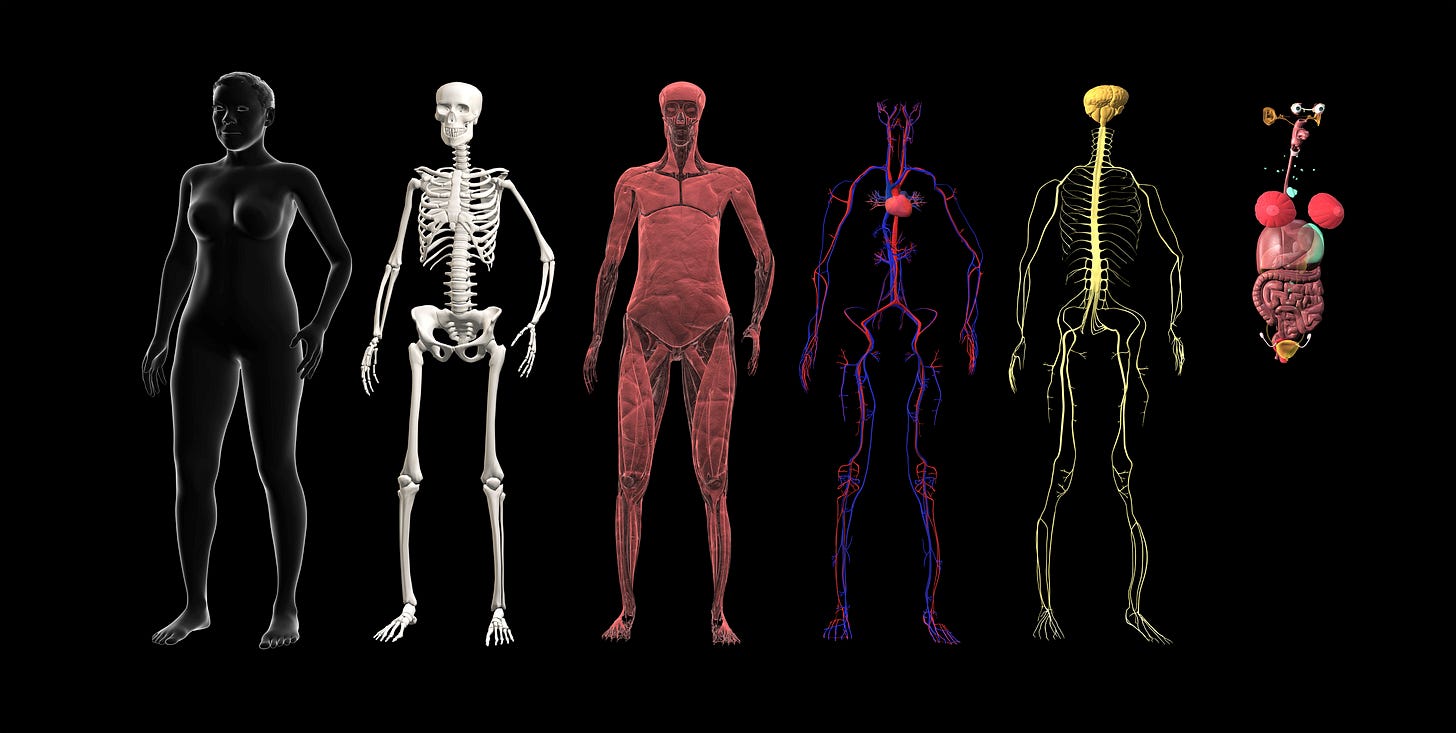 For example, instead of cutting up parts, Hedley removes the outermost layer of skin intact, then the next layer of adipose fat, displaying them as something like a body suit. He gathers our innards all together and presents them as an intestine bouquet. Hedley is so passionate about his dissections that he goes on tours, presenting the body in ways seldom seen. His latest is the nerve tour, in which he has removed the entire nervous system as a complete unit. He wants to show as graphically as possible how the human body is interconnected. He and his ilk are trying to highlight the value of recognizing those connections at a deep level, in contrast to the ways that modern science has typically dissected the body into constituent parts.